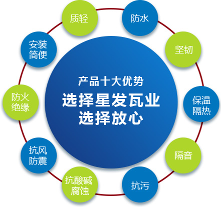 公司主要產(chǎn)品有《星發(fā)牌》合成樹脂瓦、APVC防腐耐候復(fù)合瓦、APVC發(fā)泡隔熱瓦、PVC半透明瓦、PVC防腐隔熱瓦、PVC防腐瓦、PVC防腐平板、PVC條紋板和ASA/PVC超耐候復(fù)合瓦等產(chǎn)品。產(chǎn)品一經(jīng)推出,已被廣泛應(yīng)用于國(guó)內(nèi)各類平改坡項(xiàng)目和大型工業(yè)項(xiàng)目,遠(yuǎn)銷歐洲、亞洲、美洲和非洲等國(guó)外市場(chǎng),還獲選為廣州亞運(yùn)會(huì)、深圳大運(yùn)會(huì)、四川災(zāi)后重建等工程項(xiàng)目的應(yīng)用產(chǎn)品。公司在不斷創(chuàng)新和改革的基礎(chǔ)上,力求以更好的產(chǎn)品、優(yōu)良的服務(wù),用心、專心服務(wù)好每一個(gè)客戶。